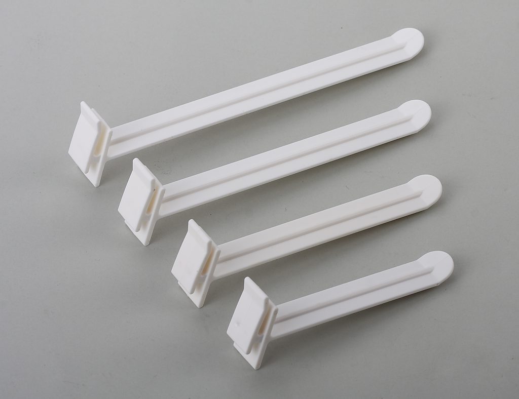 Plastic display hooks do not rust, so they work inside and outside. Many stores use them with metal frame hangers and other hanging hardware for flexible displays. IDMATE’s hooks help businesses make neat and safe product presentations.